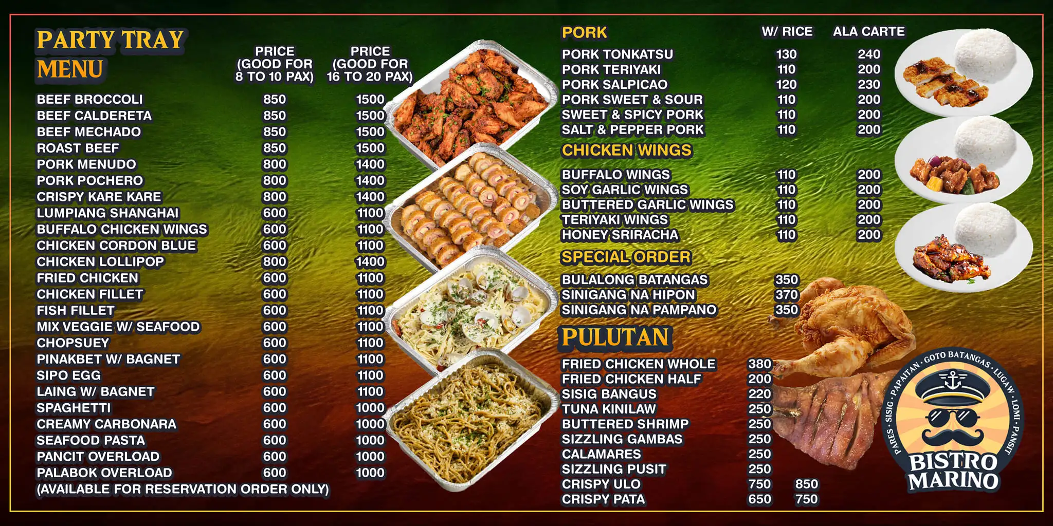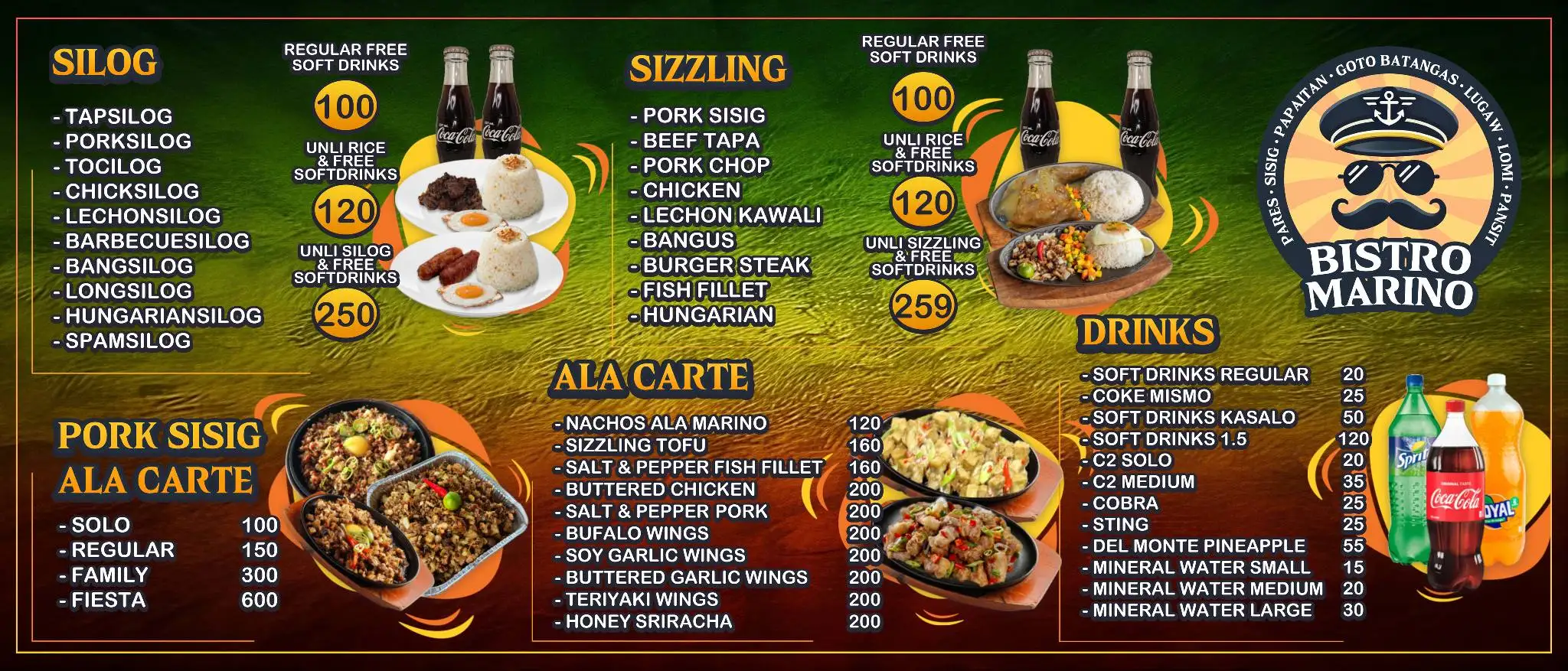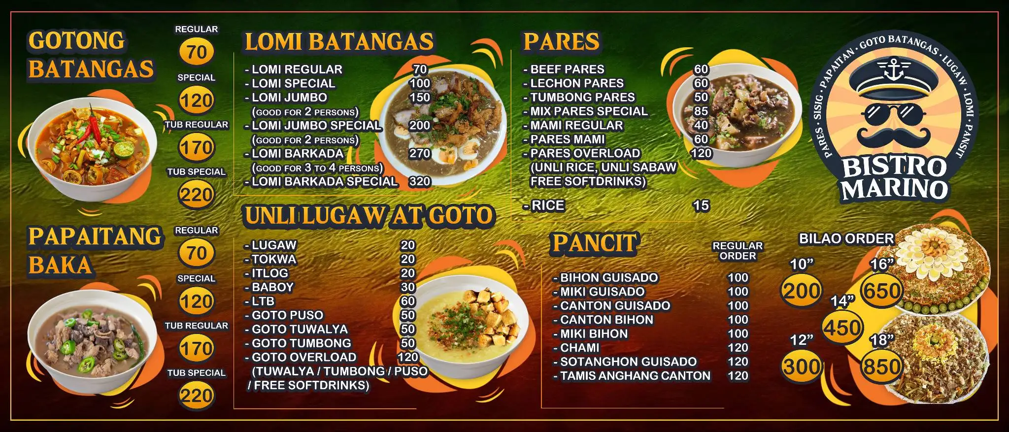 Ala CarteAll-Day BreakfastBilao OrderChicken BarbequeChicken WingsDine-inDrinksFried ChickenGotong BatangasInihawLomi BatangasPancitPapaitang BakaParesPares OverloadParty TrayPork Sisig Ala CartePulutanSilogSizzlingUnli Lugaw at GotoUnli SilogUnli Sizzling