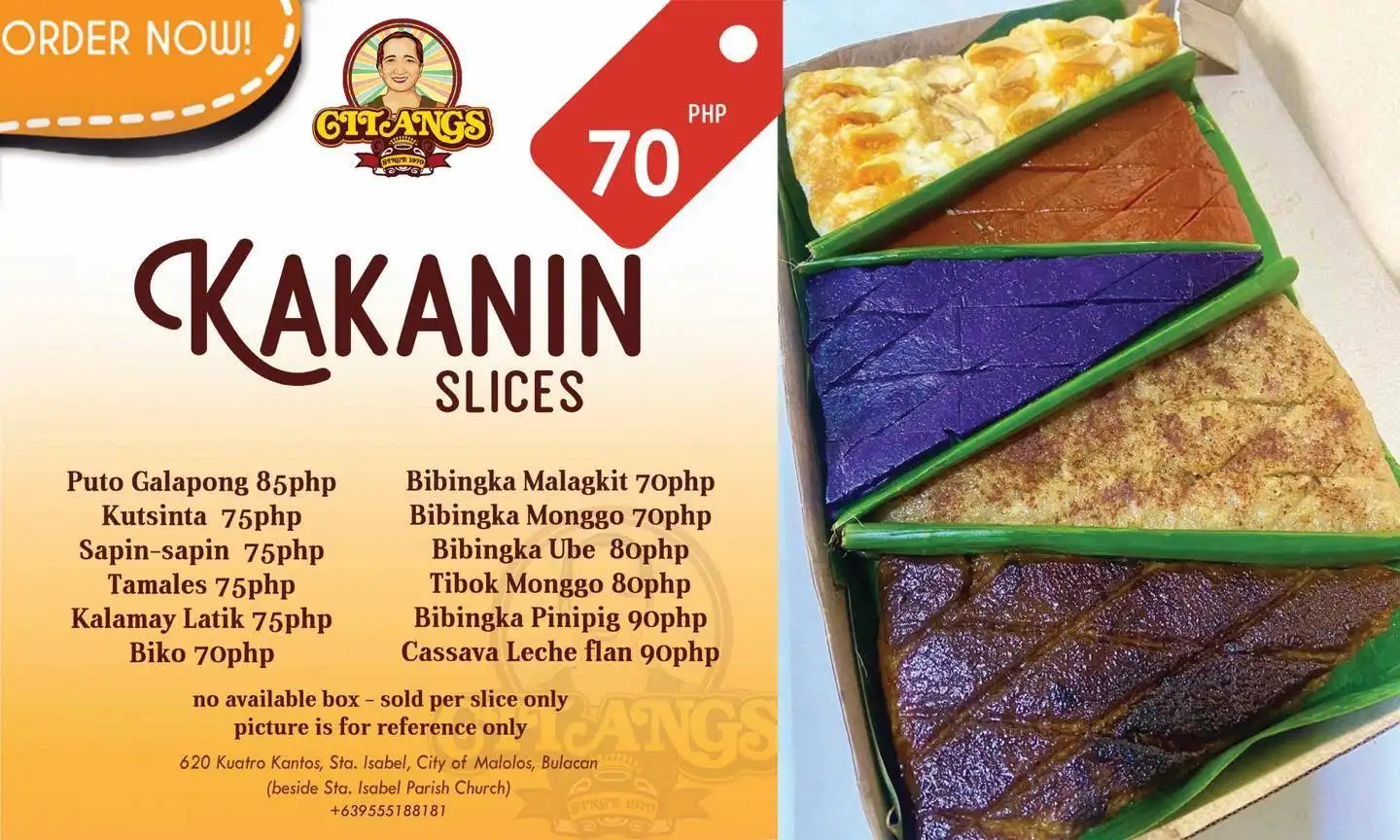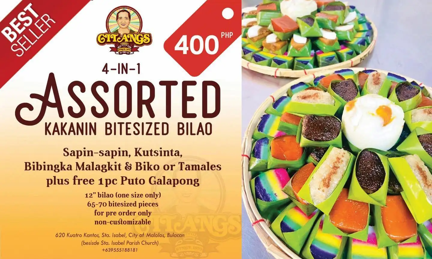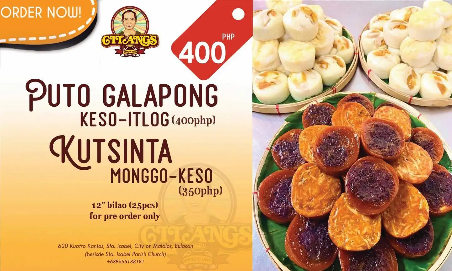 We are citangs, we offer Kakanin made from traditional Galapong, we are making kakanin since 1970, pride of malolos bulacan, meryenda and delicacies that brings back memories.. Thank you and to God be all the Glory.. God bless us all.. Malolos’ Best! ๐๐งกโค๏ธ Kakanin na masasarap, dito mahahanap! @citangssince1970 We’re open for dine in, walk-in, pre-orders for pick up & delivery. ๐๐ผ #CitangsTaraKain ๐๐งก **We’re located at 620 Kuatro Kantos Sta. Isabel, City of Malolos, Bulacan (beside Sta. Isabel Parish Church) **Tues-Sun 7am-5pm