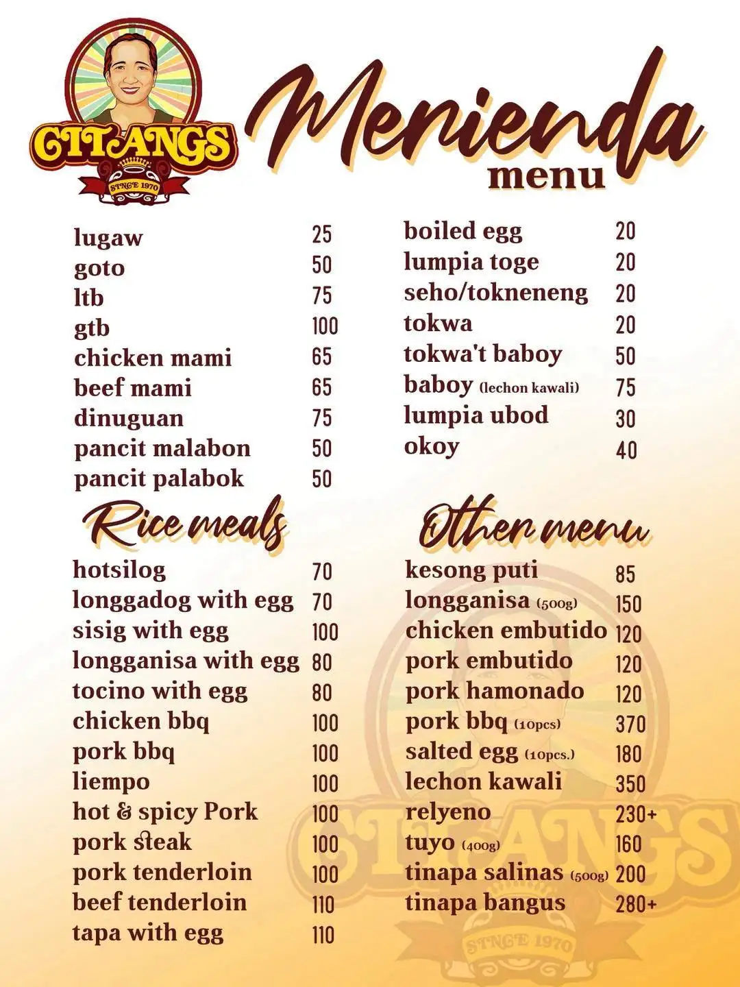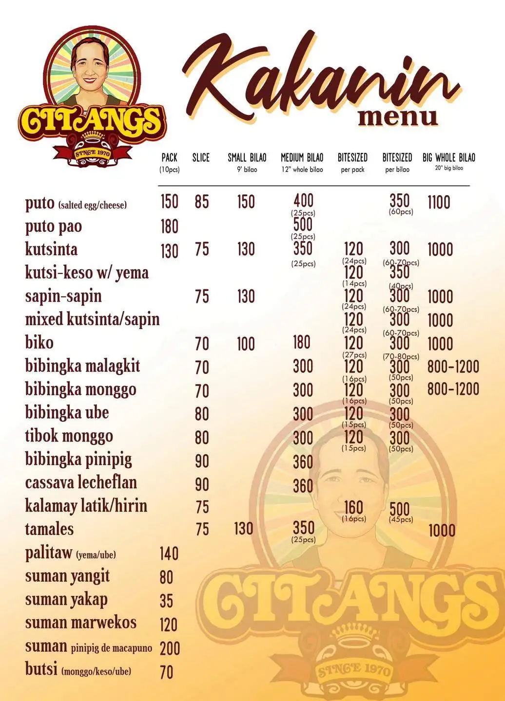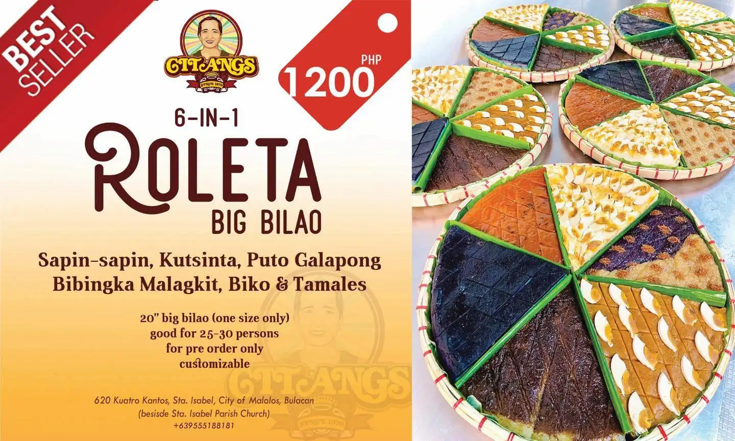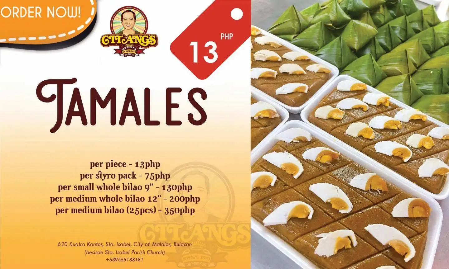 We are citangs, we offer Kakanin made from traditional Galapong, we are making kakanin since 1970, pride of malolos bulacan, meryenda and delicacies that brings back memories.. Thank you and to God be all the Glory.. God bless us all.. Malolos’ Best! ๐๐งกโค๏ธ Kakanin na masasarap, dito mahahanap! @citangssince1970 We’re open for dine in, walk-in, pre-orders for pick up & delivery. ๐๐ผ #CitangsTaraKain ๐๐งก **We’re located at 620 Kuatro Kantos Sta. Isabel, City of Malolos, Bulacan (beside Sta. Isabel Parish Church) **Tues-Sun 7am-5pm