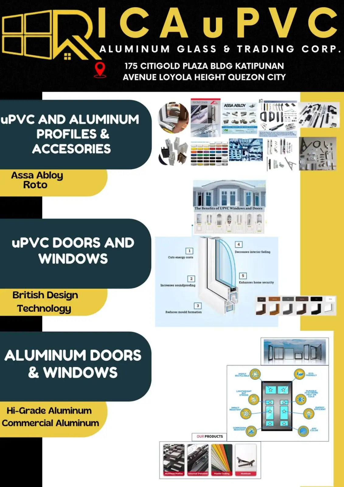 RICA uPVC ALUMINUM GLASS AND TRADING CORP. is engaged in the marketing and selling of a wide range of uPVC German Technology, RENOLIT uPVC Profile, Hi-Graded Aluminum Profile produced using Taiwan Technology, and Glass intended for the construction industry One-stop shop solutions provider Trusted by its clients not only for its technical knowledge and experience in the industry, but also for its notable and monumental projects covering residential condominiums and commercial establishments not only in the metro but also throughout the archipelago. ✔ Certified Company ✔ Satisfied Guaranteed ✔ Precise Builder ✔ Excellence Support