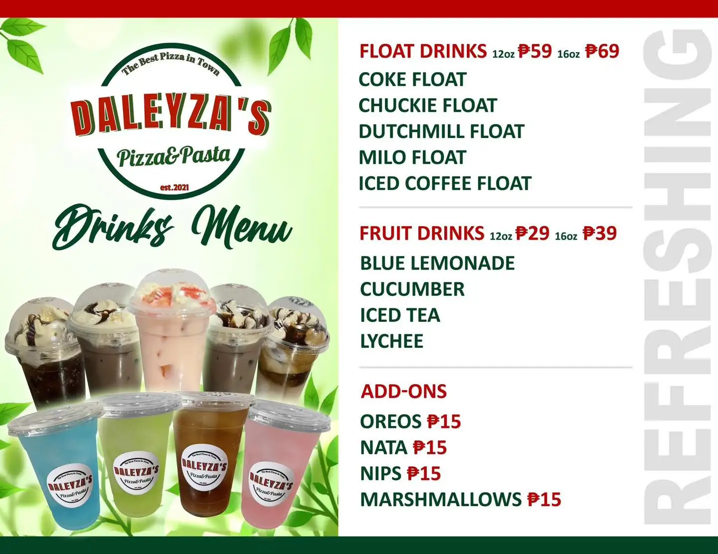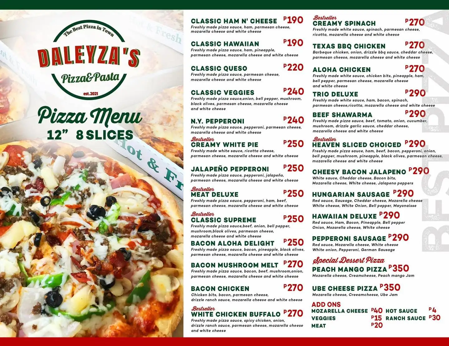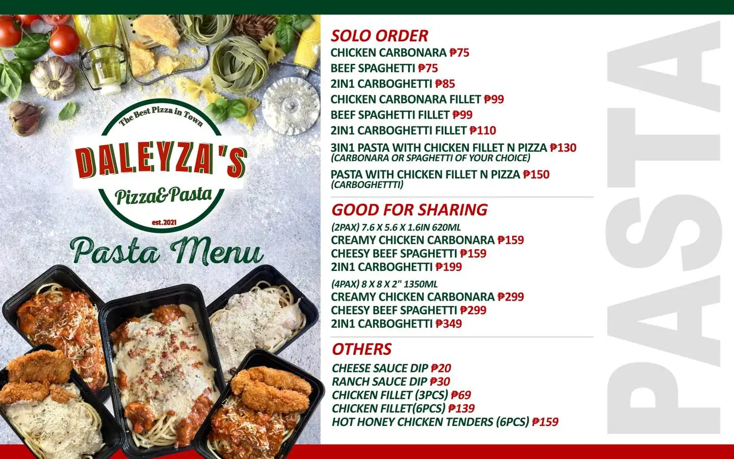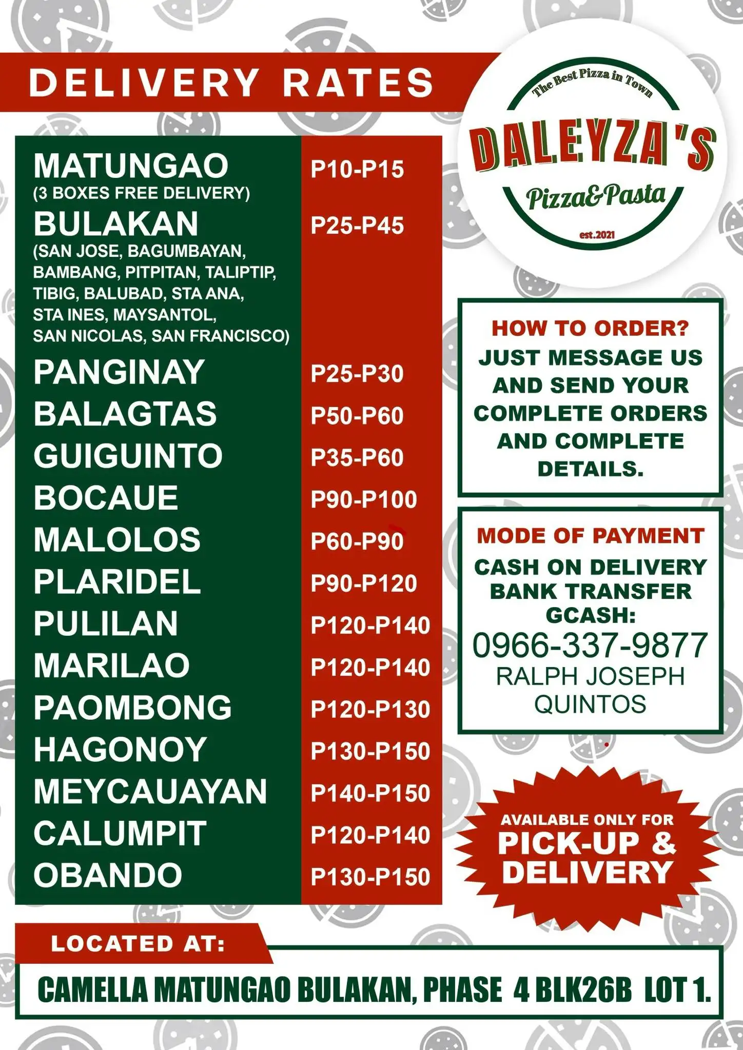 The Original Best Pizza in Town with the Best Quality Taste and Affordable price. � At Daleyza’s Pizza & Pasta, we’ve refined our menu to focus on what you love the most! 💯 With your favorite classics and bestsellers still here, every slice will be as satisfying as ever. Simplified menu, amplified flavors—because you deserve nothing but the best! MOD: Cash or Gcash Open: Thursday-Monday Closed: Tuesday&Wednesday 12:00pm - 7:30pm ⏰ We are accepting advance order 😊 For orders, please send us a message!!!