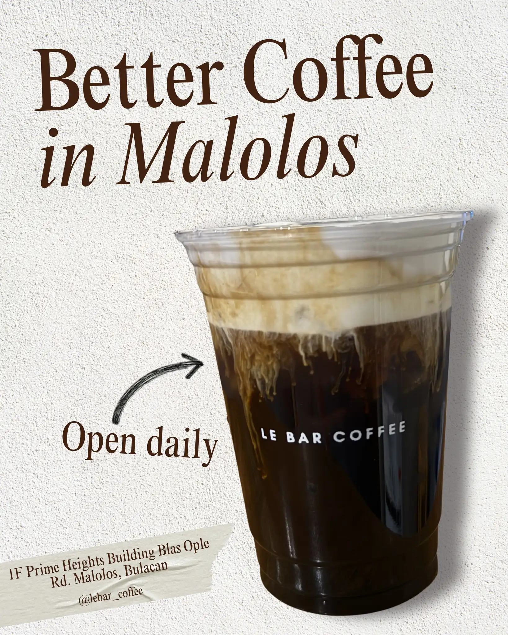 Every cup is crafted with you in mind. From the first pull to the final pour, we focus on your taste, your moments, and your experience. Because to us, it’s more than just coffee, it’s about you. Le Bar delivers straight to your doorstep, legit sulit food + your fave drinks, hassle-free. 📩 DM us to order 📍 1F Prime Heights Building, Blas Ople Rd., Malolos