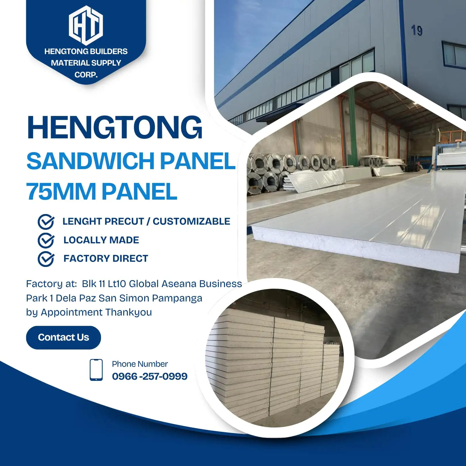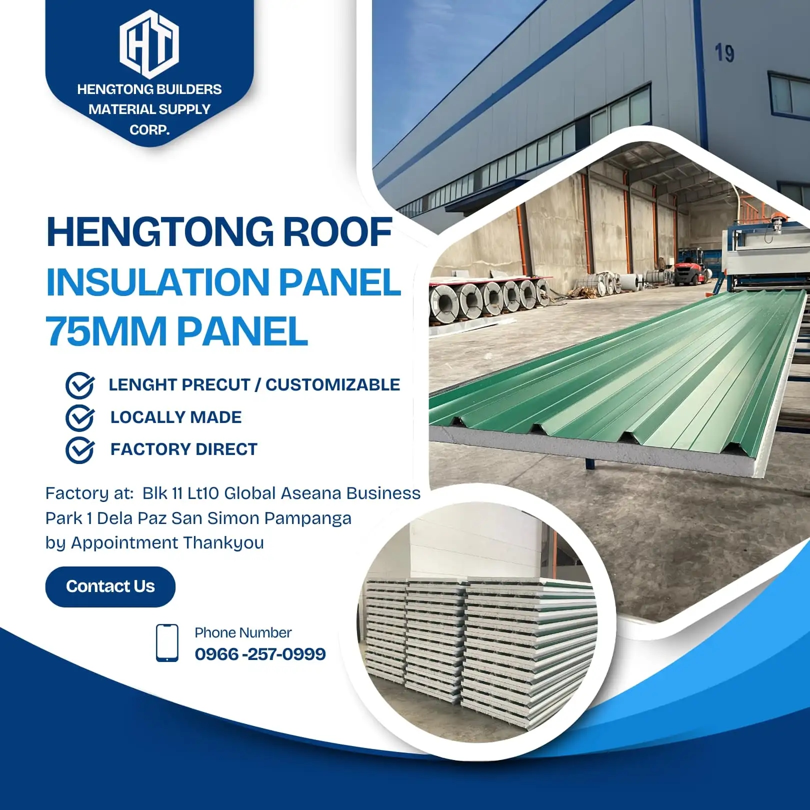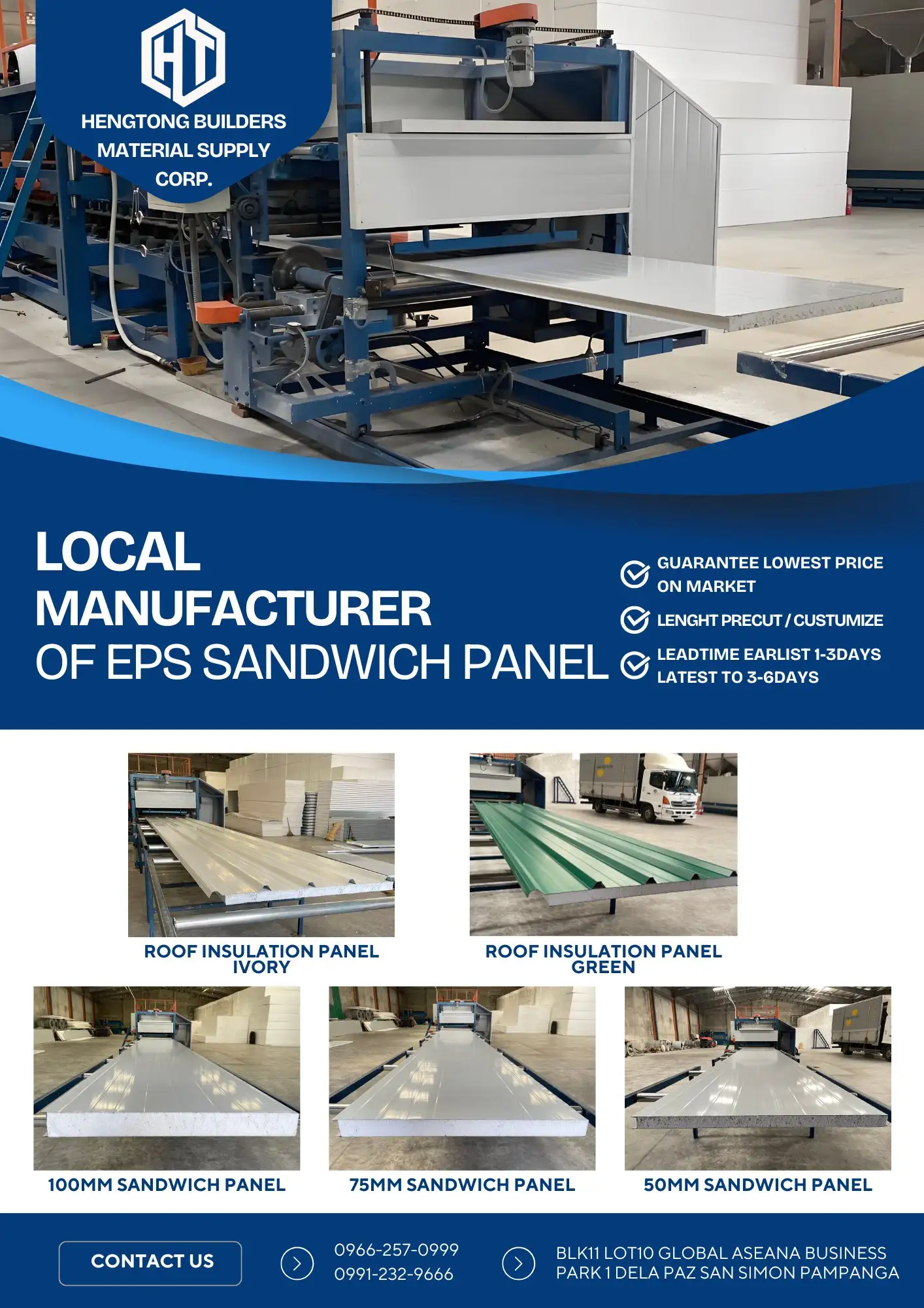 HT Prefab Materials Philippines We are the No.1 Local Manufacturer of Sandwich Panel & Roof Insulation Panel here in the Philippines 🇵ðŸ‡ðŸ‡µðŸ‡ 📌 Guarantee with Lowest Price on Market 📌 Fastest Leadtime earlist to 1-3days Latest to 3-6days We can teach and show you how to install just to set an appointment with us!! ✅ Cost 75% Less ✅ Fast assembly ✅ No renovation needed ✅ Light weight ✅ Good impact resistant ✅ High insulation ✅ Fire retardant & Water resistant ✅ Termite proof Use for: Exterior & Interior walls, Partition & Ceiling, Prefabricated House, Apartment & Commercial Building, Office & Barracks, Equipment Shelter, Tollbooth & Guardhouse, Factories & Warehouse, Food Processing Plant, Manufacturing Plant, Pharmaceuticals Product Storage, Laboratories, Clean Rooms, Poultry, Piggery, Controlled Temperature Room, Etc For more information and pricing, Get in touch with us ! 📞: 0966-257-0999 / 0991-232-9666 ðŸ“:Blk 11 lot 10 Global Aseana Business Park 1 Dela Paz San Simon Pampanga Google map: Hengtong builders Material Supply Corp THANKYOU !! 🇵ðŸ‡ðŸ‡µðŸ‡ðŸ‡µðŸ‡
