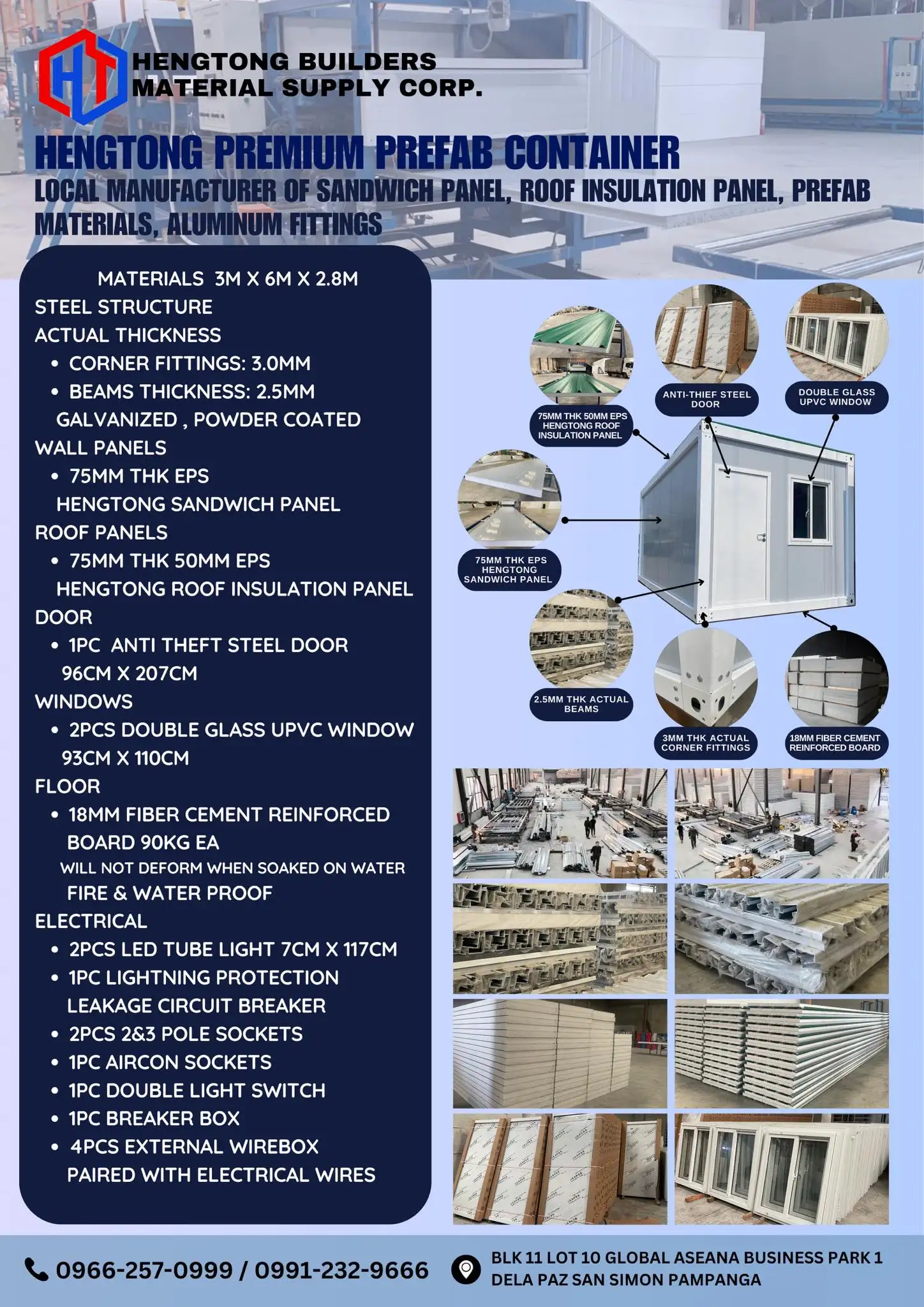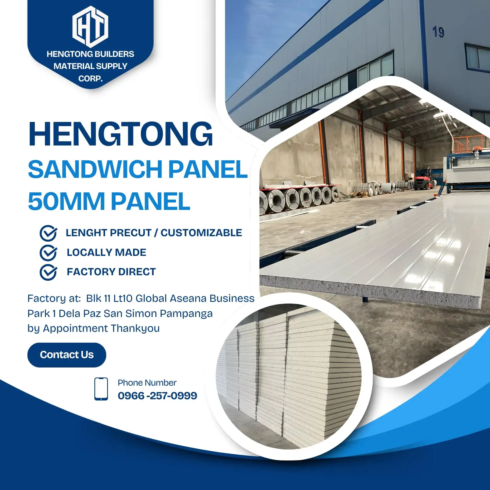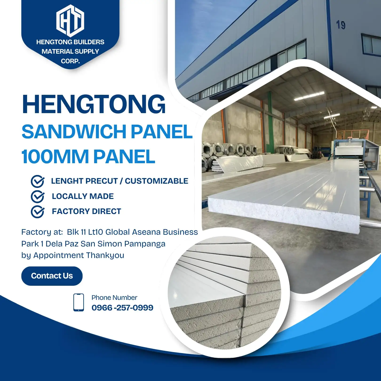 HT Prefab Materials Philippines We are the No.1 Local Manufacturer of Sandwich Panel & Roof Insulation Panel here in the Philippines 🇵ðŸ‡ðŸ‡µðŸ‡ 📌 Guarantee with Lowest Price on Market 📌 Fastest Leadtime earlist to 1-3days Latest to 3-6days We can teach and show you how to install just to set an appointment with us!! ✅ Cost 75% Less ✅ Fast assembly ✅ No renovation needed ✅ Light weight ✅ Good impact resistant ✅ High insulation ✅ Fire retardant & Water resistant ✅ Termite proof Use for: Exterior & Interior walls, Partition & Ceiling, Prefabricated House, Apartment & Commercial Building, Office & Barracks, Equipment Shelter, Tollbooth & Guardhouse, Factories & Warehouse, Food Processing Plant, Manufacturing Plant, Pharmaceuticals Product Storage, Laboratories, Clean Rooms, Poultry, Piggery, Controlled Temperature Room, Etc For more information and pricing, Get in touch with us ! 📞: 0966-257-0999 / 0991-232-9666 ðŸ“:Blk 11 lot 10 Global Aseana Business Park 1 Dela Paz San Simon Pampanga Google map: Hengtong builders Material Supply Corp THANKYOU !! 🇵ðŸ‡ðŸ‡µðŸ‡ðŸ‡µðŸ‡