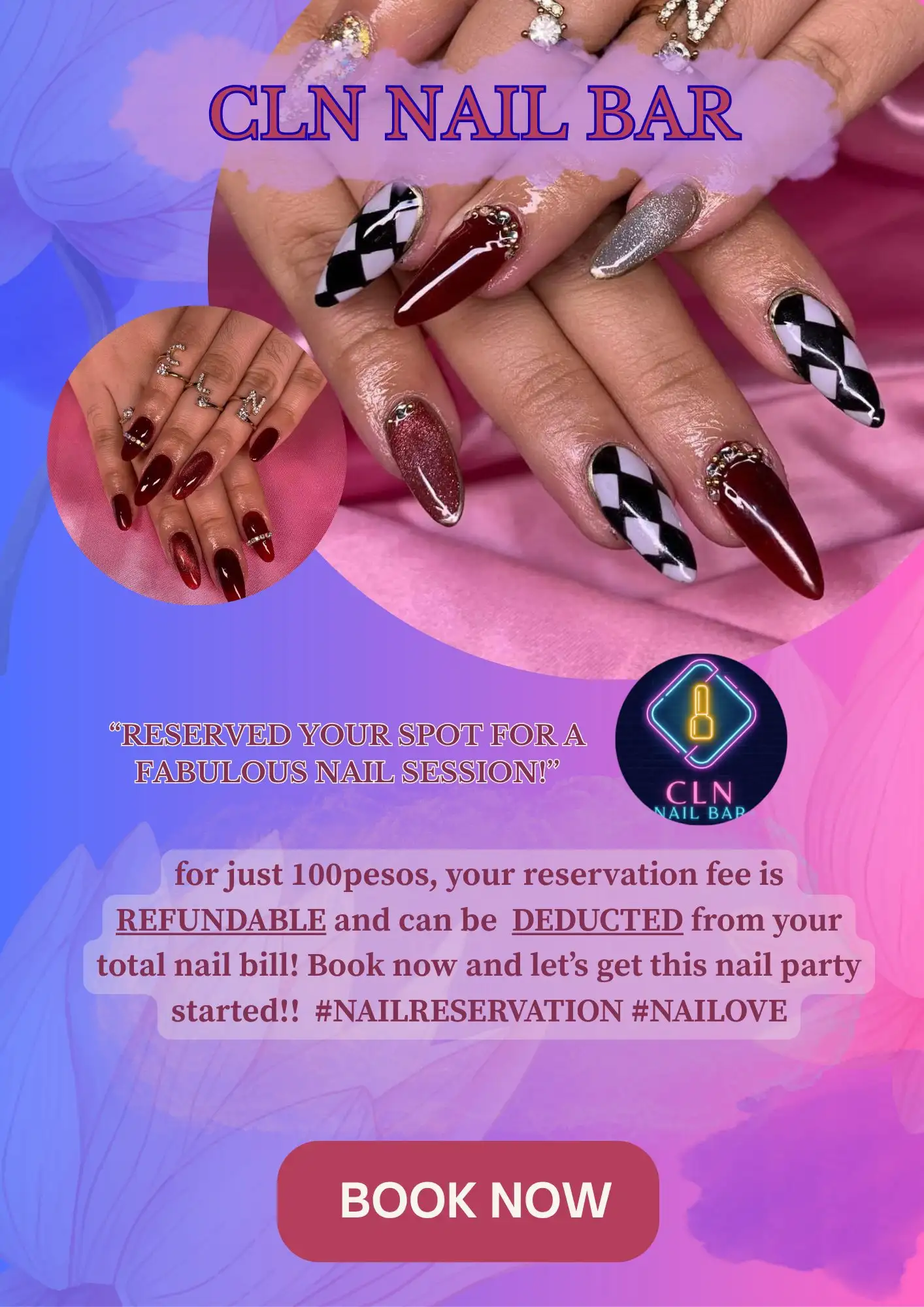 "Reserve your spot for a fabulous nail session! 💅 For just ₱100, your reservation fee is REFUNDABLE and can be DEDUCTED from your total nail bill! 💅♀️ Book now and let's get this nail party started! 🎉